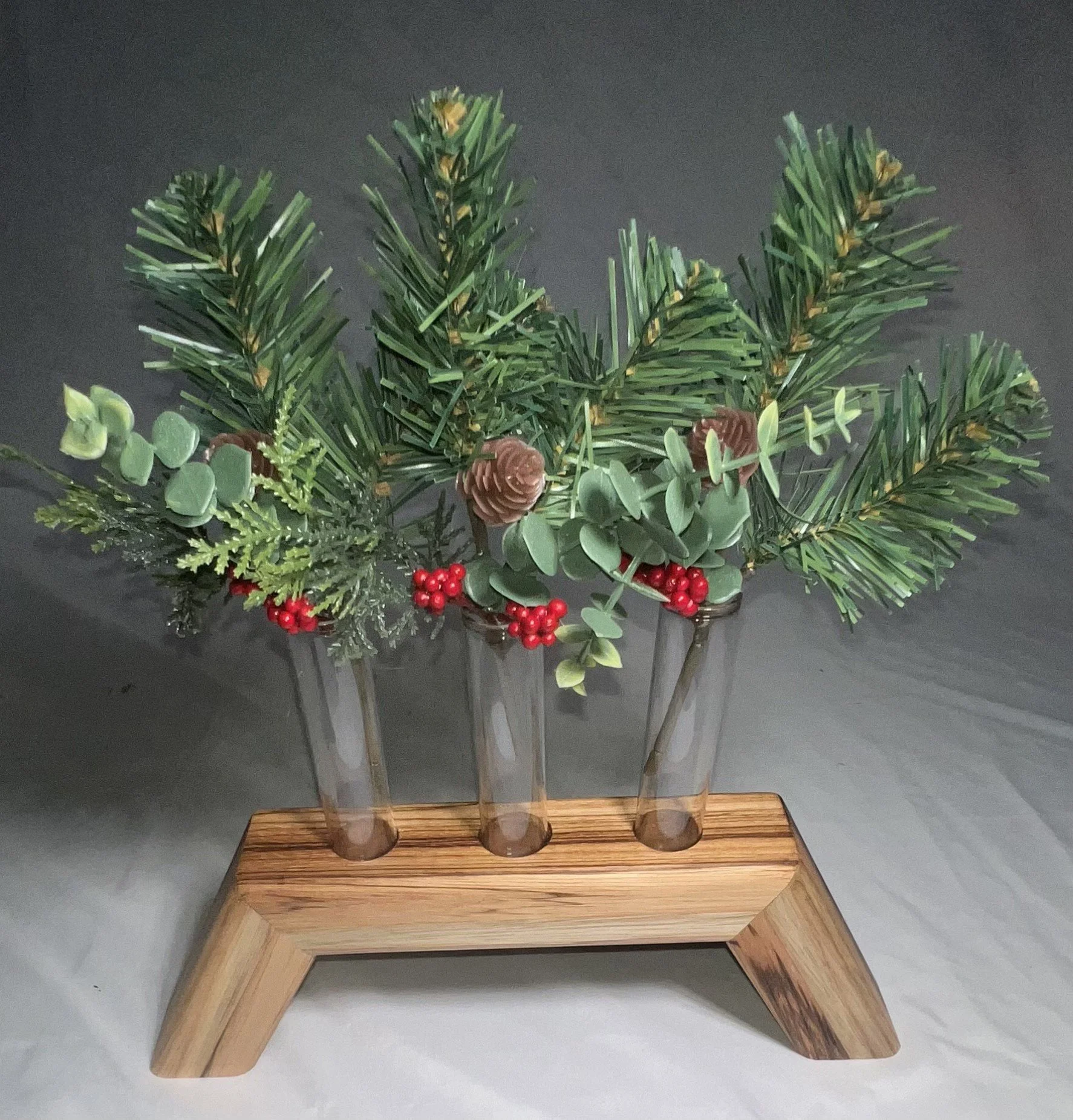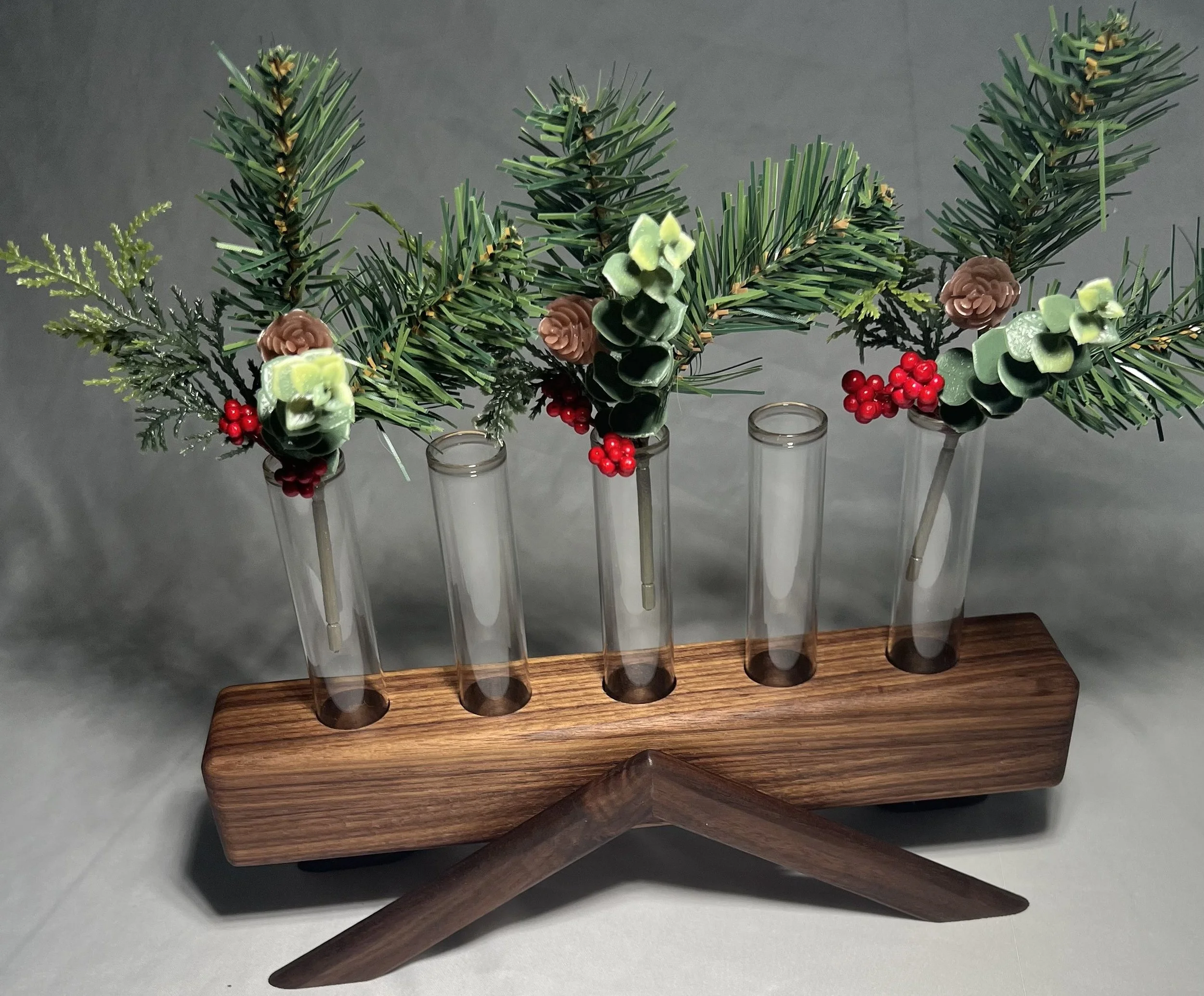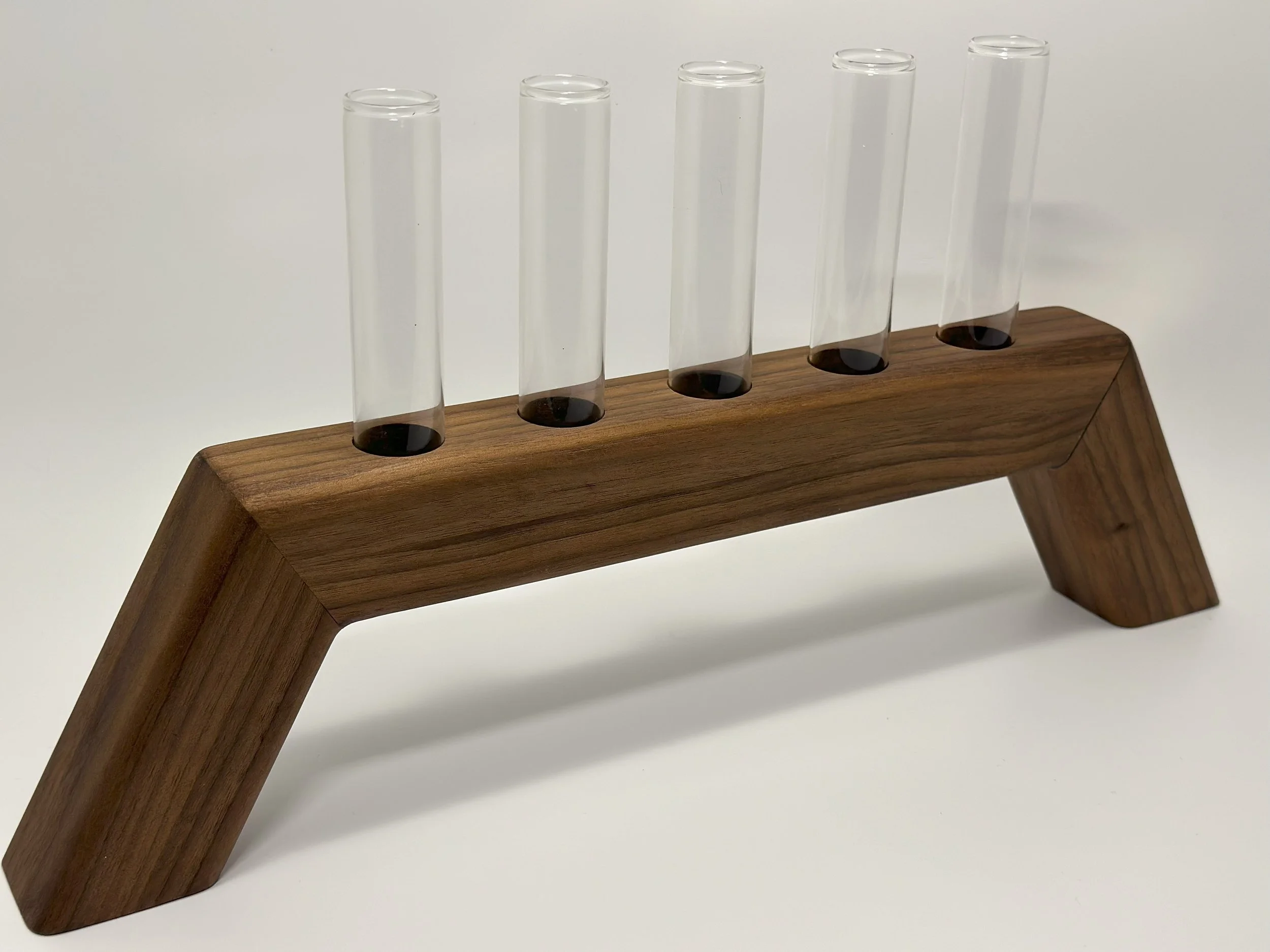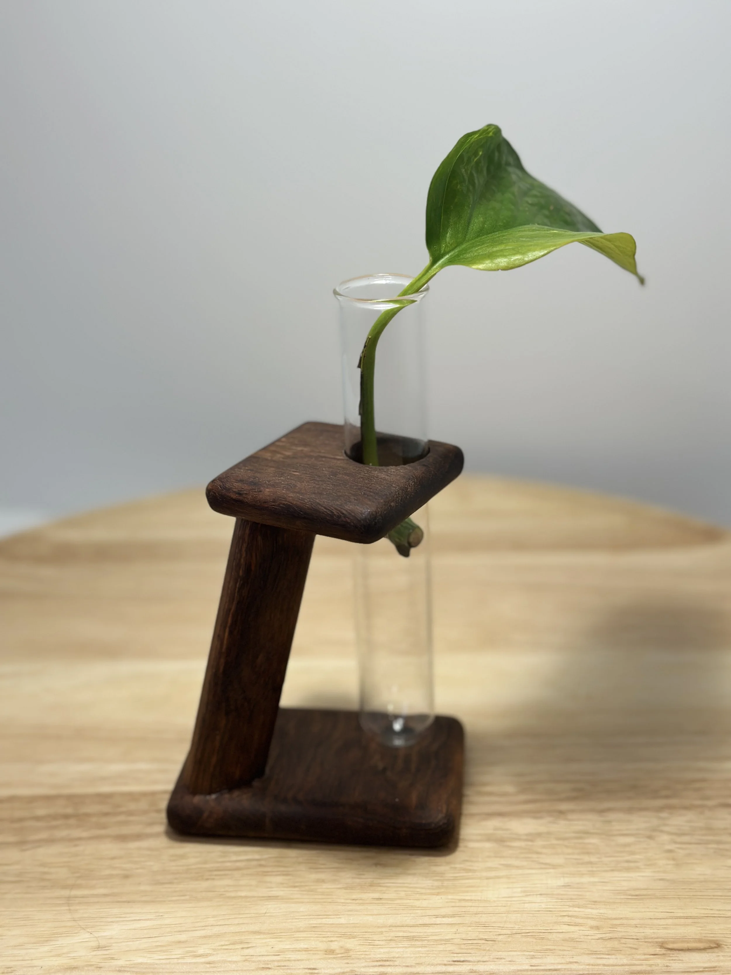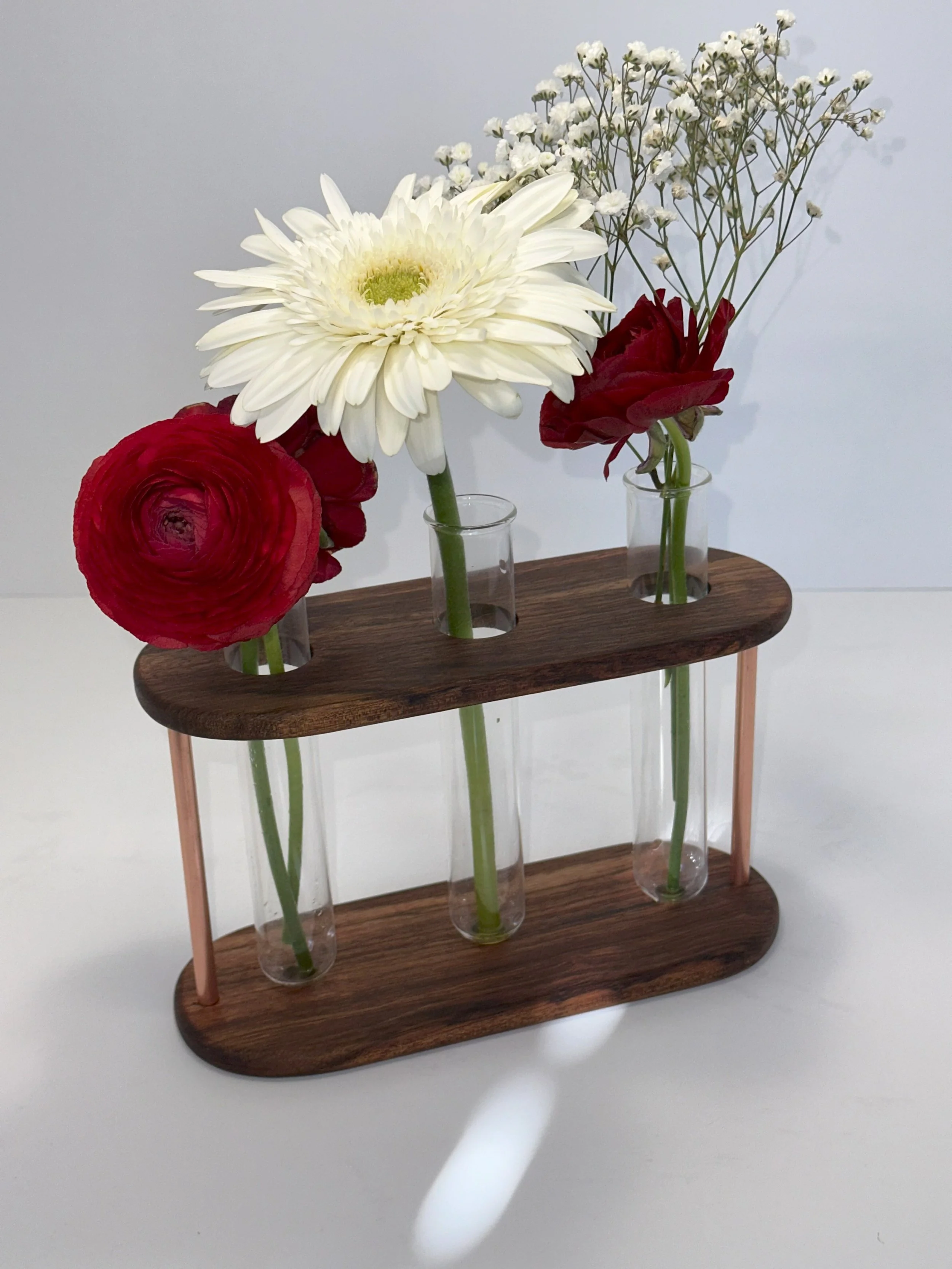 This Mid-Century Modern Propagation Station brings a unique and geometric juxtaposition to the soft and wild elegance of plants or flowers. This piece is an original design that will stand the test of time. Simply place your cuttings in water-filled tubes for a delightful display. Enhance your home decor with these handmade holders, adding a distinctive touch to any space.